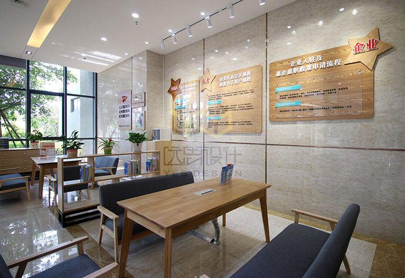 本案涉及范圍包括創(chuàng)業(yè)大廈A棟和B棟,總面積約3000多平,分別設(shè)置了一站式黨建服務(wù)區(qū)、黨建(人才)成果展廳、路演大廳、黨建動漫園、宣誓室、社會組織孵化中心、紅色創(chuàng)咖、黨建廣場等。通過大廈黨建工作,給創(chuàng)業(yè)大廈的企業(yè)和個人提供一站式服務(wù)。以鋼木結(jié)合的設(shè)計風(fēng)格,讓群眾在休閑娛樂的時候感受黨建和風(fēng)旭日的照拂,真正通過為群眾謀幸福的實際行動去影響大家,營造紅色正能量。
